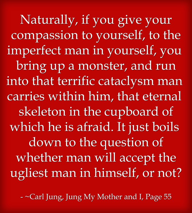 "Naturally, if you give your compassion to yourself, to the imperfect man in yourself, you bring up a monster, and run into that terrific cataclysm man carries within him, that eternal skeleton in the cupboard of which he is afraid. It just boils down to the question of whether man will accept the ugliest man in himself, or not? "