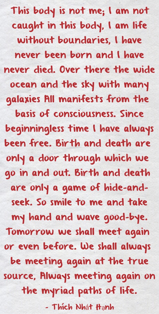 "This body is not me; I am not caught in this body, I am life without boundaries, I have never been born and I have never died. Over there the wide ocean and the sky with many galaxies All manifests from the basis of consciousness. Since beginningless time I have always been free. Birth and death are only a door through which we go in and out. Birth and death are only a game of hide-and-seek. So smile to me and take my hand and wave good-bye. Tomorrow we shall meet again or even before. We shall always be meeting again at the true source, Always meeting again on the myriad paths of life. "