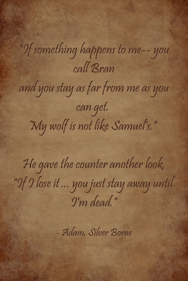 ""If something happens to me-- you call Bran and you stay as far from me as you can get. My wolf is not like Samuel's." He gave the counter another look. "If I lose it ... you just stay away until I'm dead.""