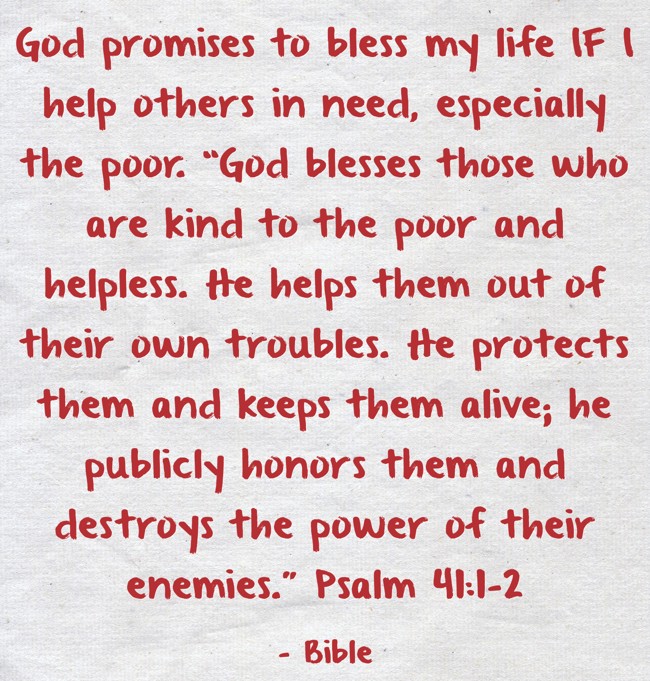 "God promises to bless my life IF I help others in need, especially the poor. “God blesses those who are kind to the poor and helpless. He helps them out of their own troubles. He protects them and keeps them alive; he publicly honors them and destroys the power of their enemies.” Psalm 41:1-2"