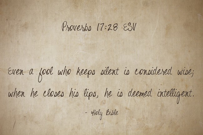 "Proverbs 17:28 ESV Even a fool who keeps silent is considered wise; when he closes his lips, he is deemed intelligent."