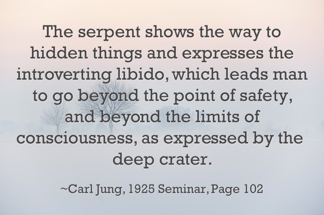 "The serpent shows the way to hidden things and expresses the introverting libido, which leads man to go beyond the point of safety, and beyond the limits of consciousness, as expressed by the deep crater."