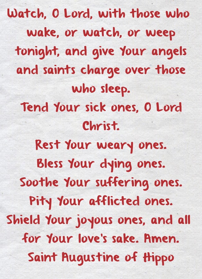 "Watch, O Lord, with those who wake, or watch, or weep tonight, and give Your angels and saints charge over those who sleep. Tend Your sick ones, O Lord Christ. Rest Your weary ones. Bless Your dying ones. Soothe Your suffering ones. Pity Your afflicted ones. Shield Your joyous ones, and all for Your love’s sake. Amen. Saint Augustine of Hippo"
