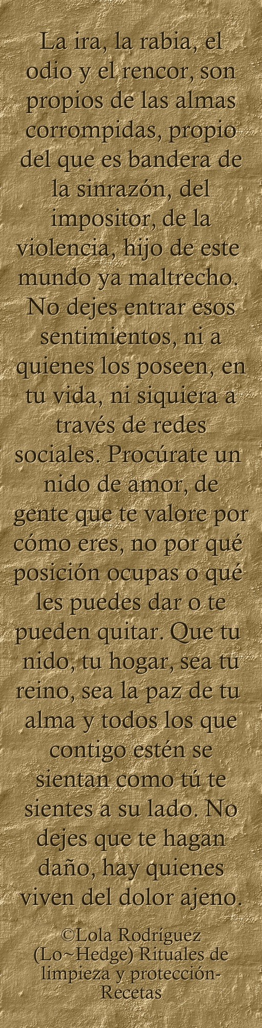 "La ira, la rabia, el odio y el rencor, son propios de las almas corrompidas, propio del que es bandera de la sinrazón, del impositor, de la violencia, hijo de este mundo ya maltrecho. No dejes entrar esos sentimientos, ni a quienes los poseen, en tu vida, ni siquiera a través de redes sociales. Procúrate un nido de amor, de gente que te valore por cómo eres, no por qué posición ocupas o qué les puedes dar o te pueden quitar. Que tu nido, tu hogar, sea tu reino, sea la paz de tu alma y todos los que contigo estén se sientan como tú te sientes a su lado. No dejes que te hagan daño, hay quienes viven del dolor ajeno."