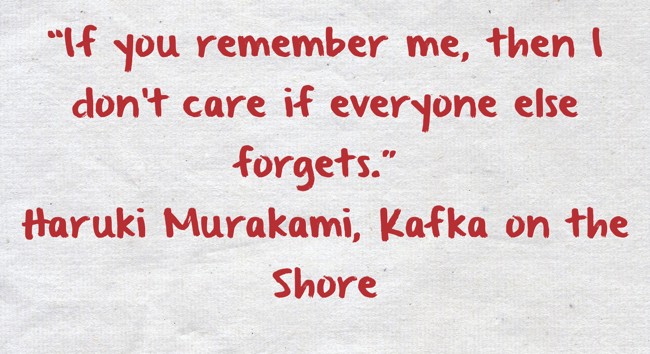 "“If you remember me, then I don't care if everyone else forgets.” Haruki Murakami, Kafka on the Shore"