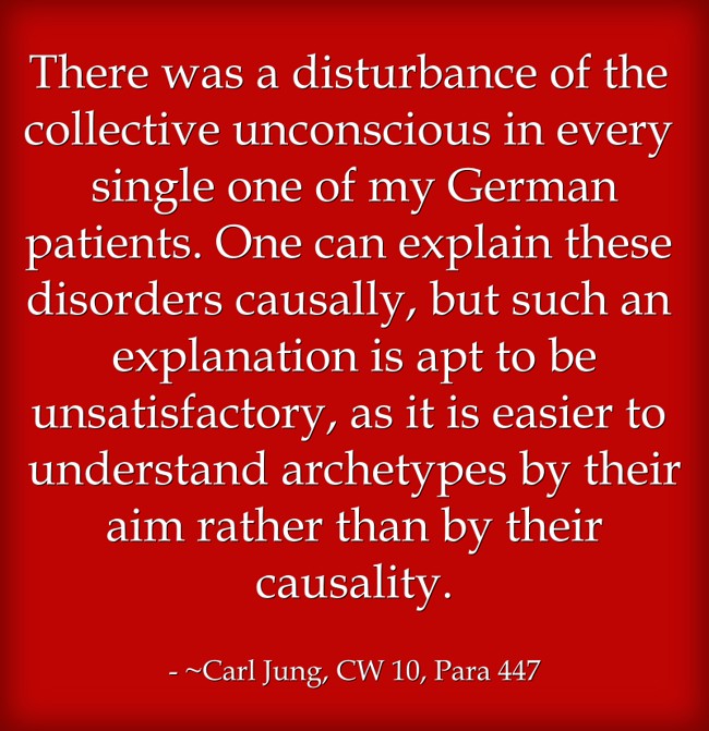 "There was a disturbance of the collective unconscious in every single one of my German patients. One can explain these disorders causally, but such an explanation is apt to be unsatisfactory, as it is easier to understand archetypes by their aim rather than by their causality. "