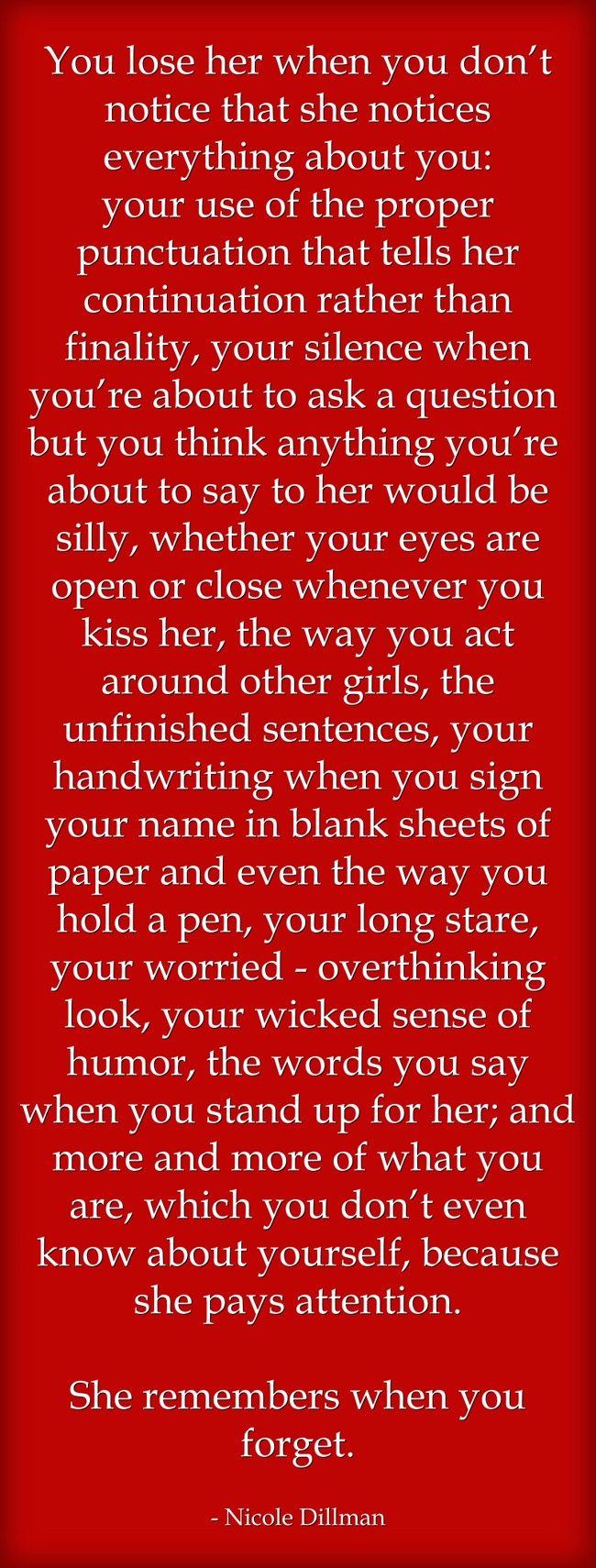 "You lose her when you don’t notice that she notices everything about you: your use of the proper punctuation that tells her continuation rather than finality, your silence when you’re about to ask a question but you think anything you’re about to say to her would be silly, whether your eyes are open or close whenever you kiss her, the way you act around other girls, the unfinished sentences, your handwriting when you sign your name in blank sheets of paper and even the way you hold a pen, your long stare, your worried - overthinking look, your wicked sense of humor, the words you say when you stand up for her; and more and more of what you are, which you don’t even know about yourself, because she pays attention. She remembers when you forget."
