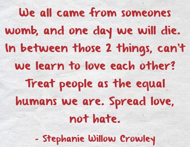 "We all came from someones womb, and one day we will die. In between those 2 things, can't we learn to love each other? Treat people as the equal humans we are. Spread love, not hate."