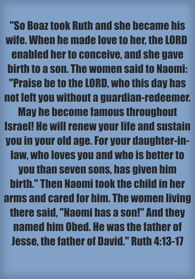 ""So Boaz took Ruth and she became his wife. When he made love to her, the LORD enabled her to conceive, and she gave birth to a son. The women said to Naomi: "Praise be to the LORD, who this day has not left you without a guardian-redeemer. May he become famous throughout Israel! He will renew your life and sustain you in your old age. For your daughter-in-law, who loves you and who is better to you than seven sons, has given him birth." Then Naomi took the child in her arms and cared for him. The women living there said, "Naomi has a son!" And they named him Obed. He was the father of Jesse, the father of David." Ruth 4:13-17 "