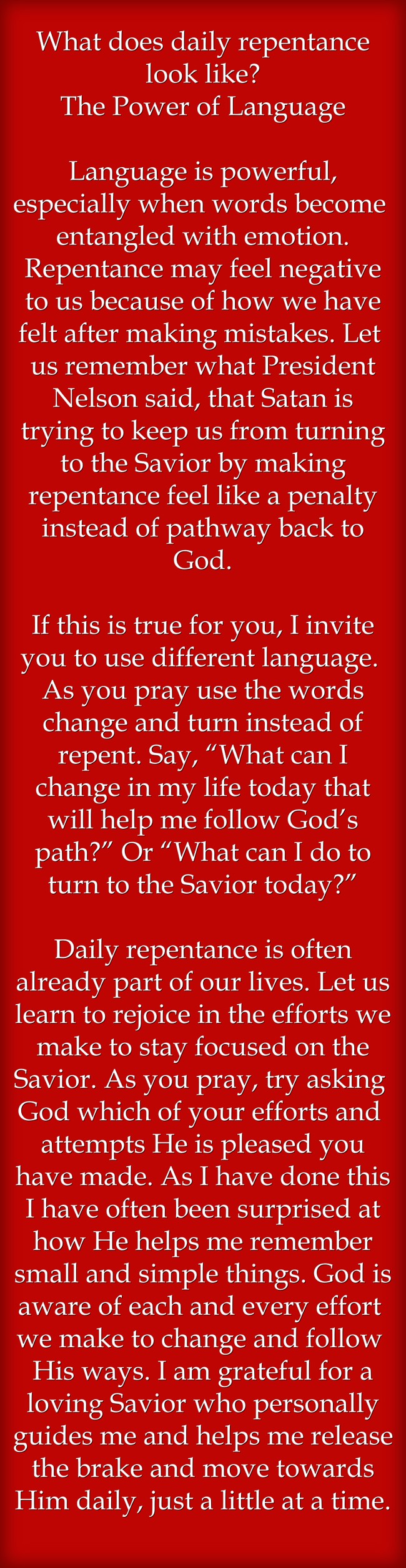 "What does daily repentance look like? The Power of Language Language is powerful, especially when words become entangled with emotion. Repentance may feel negative to us because of how we have felt after making mistakes. Let us remember what President Nelson said, that Satan is trying to keep us from turning to the Savior by making repentance feel like a penalty instead of pathway back to God. If this is true for you, I invite you to use different language. As you pray use the words change and turn instead of repent. Say, “What can I change in my life today that will help me follow God’s path?” Or “What can I do to turn to the Savior today?” Daily repentance is often already part of our lives. Let us learn to rejoice in the efforts we make to stay focused on the Savior. As you pray, try asking God which of your efforts and attempts He is pleased you have made. As I have done this I have often been surprised at how He helps me remember small and simple things. God is aware of each and every effort we make to change and follow His ways. I am grateful for a loving Savior who personally guides me and helps me release the brake and move towards Him daily, just a little at a time."