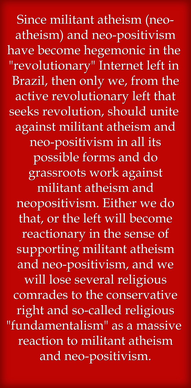 "Since militant atheism (neo-atheism) and neo-positivism have become hegemonic in the "revolutionary" Internet left in Brazil, then only we, from the active revolutionary left that seeks revolution, should unite against militant atheism and neo-positivism in all its possible forms and do grassroots work against militant atheism and neopositivism. Either we do that, or the left will become reactionary in the sense of supporting militant atheism and neo-positivism, and we will lose several religious comrades to the conservative right and so-called religious "fundamentalism" as a massive reaction to militant atheism and neo-positivism."