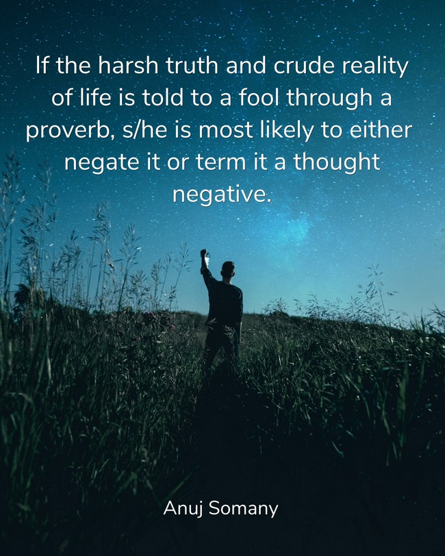 "If the harsh truth and crude reality of life is told to a fool through a proverb, s/he is most likely to either negate it or term it a thought negative."