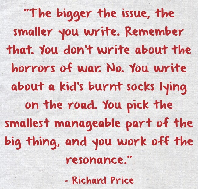 " "The bigger the issue, the smaller you write. Remember that. You don't write about the horrors of war. No. You write about a kid's burnt socks lying on the road. You pick the smallest manageable part of the big thing, and you work off the resonance.""
