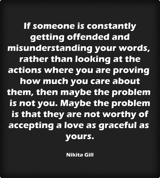 "If someone is constantly getting offended and misunderstanding your words, rather than looking at the actions where you are proving how much you care about them, then maybe the problem is not you. Maybe the problem is that they are not worthy of accepting a love as graceful as yours."