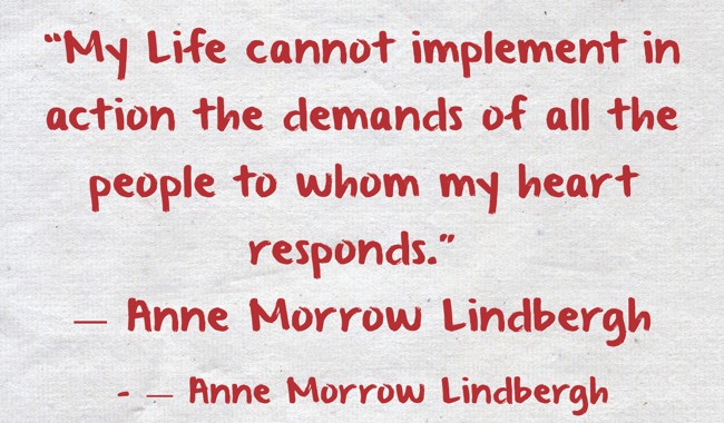 " “My Life cannot implement in action the demands of all the people to whom my heart responds.” ― Anne Morrow Lindbergh "