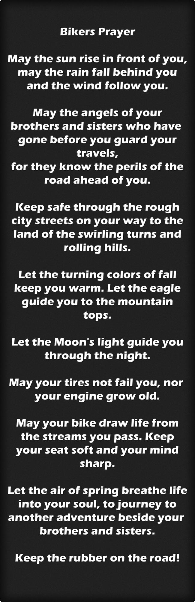 "Bikers Prayer May the sun rise in front of you, may the rain fall behind you and the wind follow you. May the angels of your brothers and sisters who have gone before you guard your travels, for they know the perils of the road ahead of you. Keep safe through the rough city streets on your way to the land of the swirling turns and rolling hills. Let the turning colors of fall keep you warm. Let the eagle guide you to the mountain tops. Let the Moon's light guide you through the night. May your tires not fail you, nor your engine grow old. May your bike draw life from the streams you pass. Keep your seat soft and your mind sharp. Let the air of spring breathe life into your soul, to journey to another adventure beside your brothers and sisters. Keep the rubber on the road!"