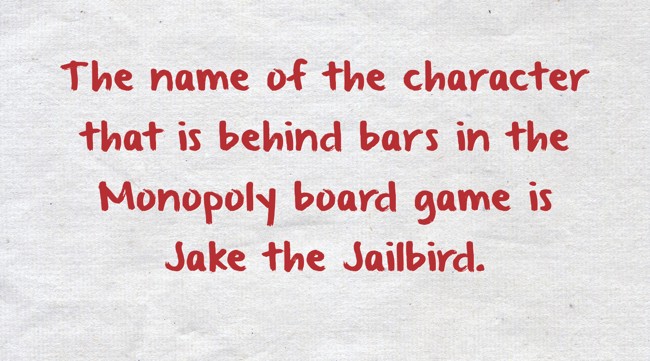 "The name of the character that is behind bars in the Monopoly board game is Jake the Jailbird. "