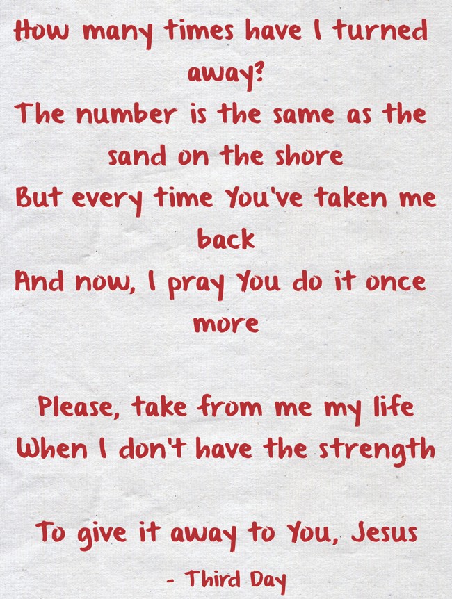 "How many times have I turned away? The number is the same as the sand on the shore But every time You've taken me back And now, I pray You do it once more Please, take from me my life When I don't have the strength To give it away to You, Jesus"