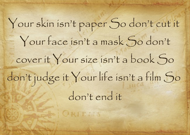 "Your skin isn’t paper So don’t cut it Your face isn’t a mask So don’t cover it Your size isn’t a book So don’t judge it Your life isn’t a film So don’t end it"