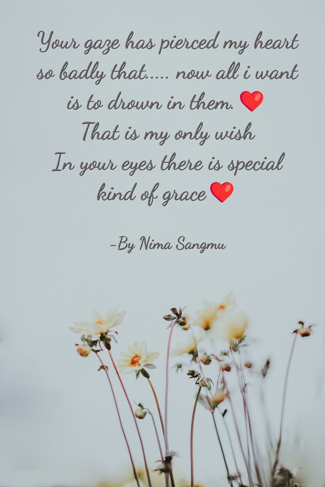 "Your gaze has pierced my heart so badly that..... now all i want is to drown in them.❤ That is my only wish In your eyes there is special kind of grace❤"