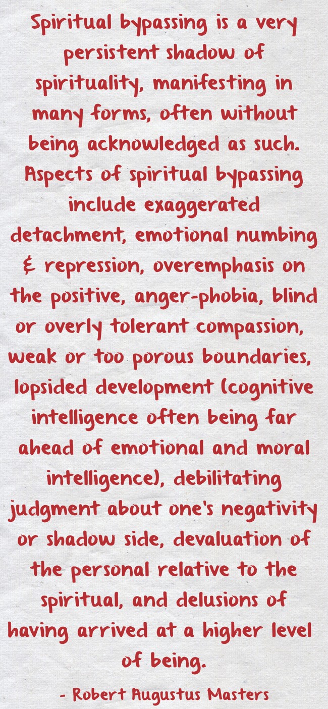 "Spiritual bypassing is a very persistent shadow of spirituality, manifesting in many forms, often without being acknowledged as such. Aspects of spiritual bypassing include exaggerated detachment, emotional numbing & repression, overemphasis on the positive, anger-phobia, blind or overly tolerant compassion, weak or too porous boundaries, lopsided development (cognitive intelligence often being far ahead of emotional and moral intelligence), debilitating judgment about one’s negativity or shadow side, devaluation of the personal relative to the spiritual, and delusions of having arrived at a higher level of being."