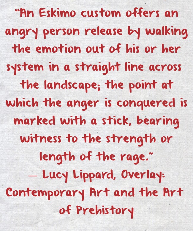 "“An Eskimo custom offers an angry person release by walking the emotion out of his or her system in a straight line across the landscape; the point at which the anger is conquered is marked with a stick, bearing witness to the strength or length of the rage.” ― Lucy Lippard, Overlay: Contemporary Art and the Art of Prehistory"