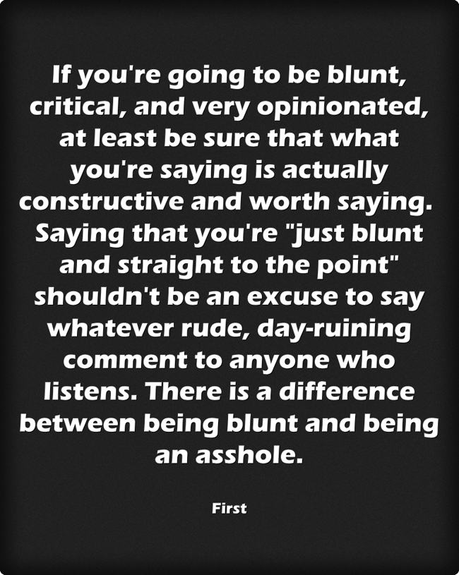 "If you're going to be blunt, critical, and very opinionated, at least be sure that what you're saying is actually constructive and worth saying. Saying that you're "just blunt and straight to the point" shouldn't be an excuse to say whatever rude, day-ruining comment to anyone who listens. There is a difference between being blunt and being an asshole."