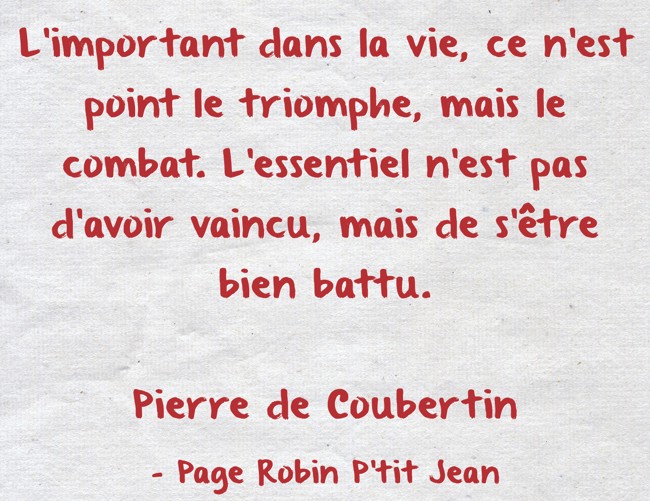 "L'important dans la vie, ce n'est point le triomphe, mais le combat. L'essentiel n'est pas d'avoir vaincu, mais de s'être bien battu. Pierre de Coubertin"