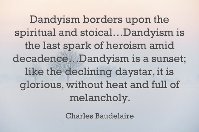 "Dandyism borders upon the spiritual and stoical…Dandyism is the last spark of heroism amid decadence…Dandyism is a sunset; like the declining daystar, it is glorious, without heat and full of melancholy."