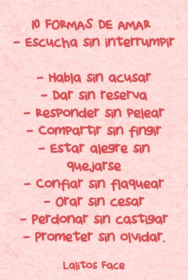 "10 FORMAS DE AMAR - Escucha sin interrumpir - Habla sin acusar - Dar sin reserva - Responder sin pelear - Compartir sin fingir - Estar alegre sin quejarse - Confiar sin flaquear - Orar sin cesar - Perdonar sin castigar - Prometer sin olvidar. "
