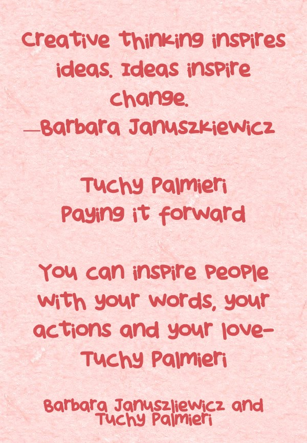 "Creative thinking inspires ideas. Ideas inspire change. —Barbara Januszkiewicz Tuchy Palmieri Paying it forward You can inspire people with your words, your actions and your love- Tuchy Palmieri"