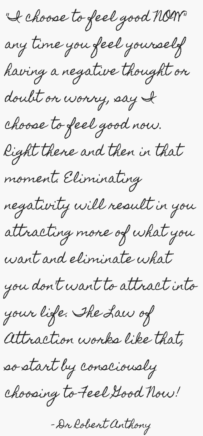 ""I choose to feel good NOW" any time you feel yourself having a negative thought or doubt or worry, say I choose to feel good now. Right there and then in that moment. Eliminating negativity will result in you attracting more of what you want and eliminate what you don't want to attract into your life. The Law of Attraction works like that, so start by consciously choosing to Feel Good Now!"