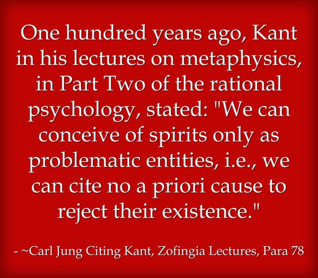 "One hundred years ago, Kant in his lectures on metaphysics, in Part Two of the rational psychology, stated: "We can conceive of spirits only as problematic entities, i.e., we can cite no a priori cause to reject their existence." "