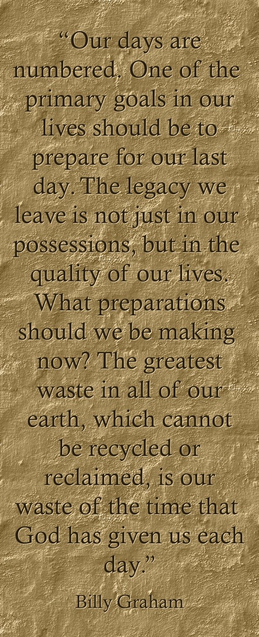 "“Our days are numbered. One of the primary goals in our lives should be to prepare for our last day. The legacy we leave is not just in our possessions, but in the quality of our lives. What preparations should we be making now? The greatest waste in all of our earth, which cannot be recycled or reclaimed, is our waste of the time that God has given us each day.”"