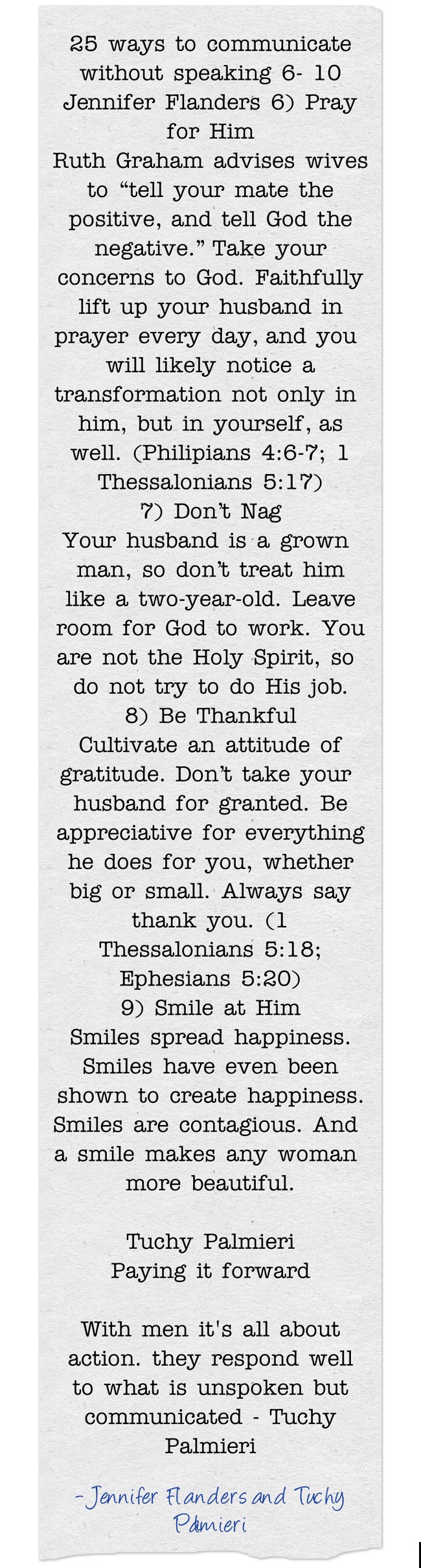 "25 ways to communicate without speaking 6- 10 Jennifer Flanders 6) Pray for Him Ruth Graham advises wives to “tell your mate the positive, and tell God the negative.” Take your concerns to God. Faithfully lift up your husband in prayer every day, and you will likely notice a transformation not only in him, but in yourself, as well. (Philipians 4:6-7; 1 Thessalonians 5:17) 7) Don’t Nag Your husband is a grown man, so don’t treat him like a two-year-old. Leave room for God to work. You are not the Holy Spirit, so do not try to do His job. 8) Be Thankful Cultivate an attitude of gratitude. Don’t take your husband for granted. Be appreciative for everything he does for you, whether big or small. Always say thank you. (1 Thessalonians 5:18; Ephesians 5:20) 9) Smile at Him Smiles spread happiness. Smiles have even been shown to create happiness. Smiles are contagious. And a smile makes any woman more beautiful. Tuchy Palmieri Paying it forward With men it's all about action. they respond well to what is unspoken but communicated - Tuchy Palmieri"