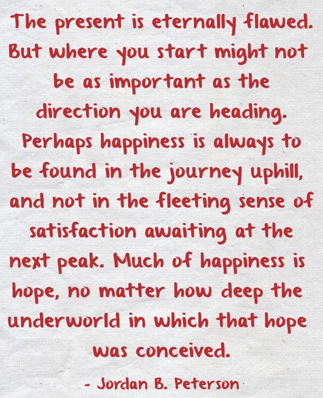 "The present is eternally flawed. But where you start might not be as important as the direction you are heading. Perhaps happiness is always to be found in the journey uphill, and not in the fleeting sense of satisfaction awaiting at the next peak. Much of happiness is hope, no matter how deep the underworld in which that hope was conceived."