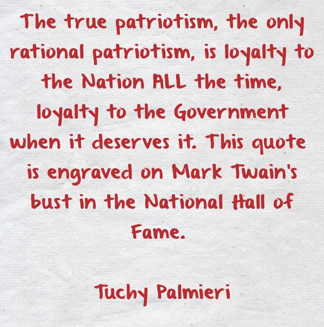 "The true patriotism, the only rational patriotism, is loyalty to the Nation ALL the time, loyalty to the Government when it deserves it. This quote is engraved on Mark Twain's bust in the National Hall of Fame. Tuchy Palmieri"