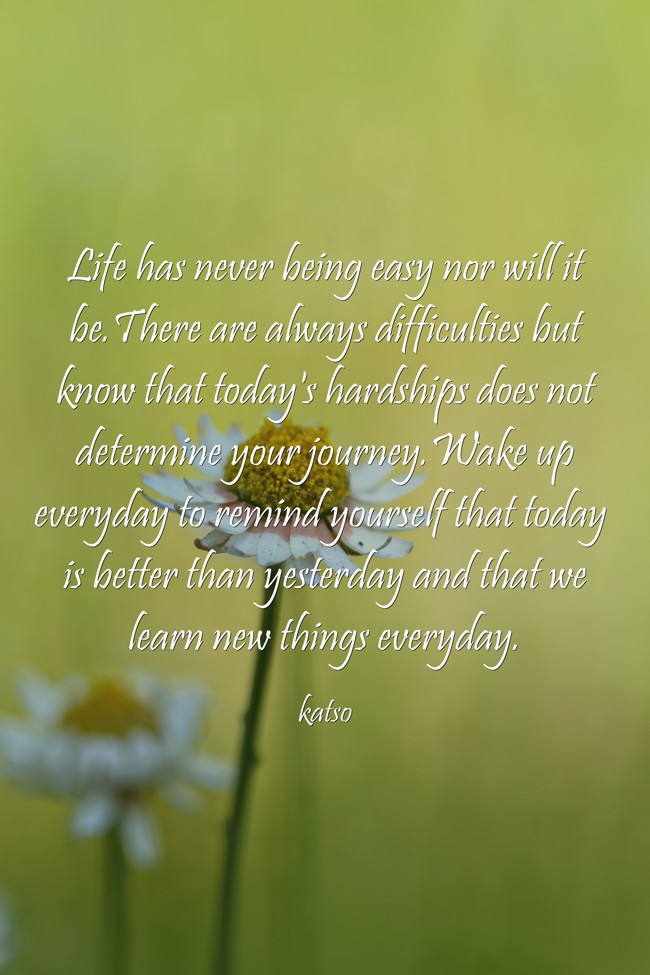 "Life has never being easy nor will it be.There are always difficulties but know that today's hardships does not determine your journey.Wake up everyday to remind yourself that today is better than yesterday and that we learn new things everyday."