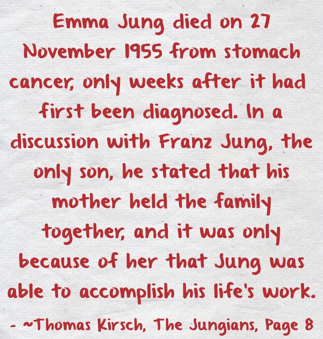 "Emma Jung died on 27 November 1955 from stomach cancer, only weeks after it had first been diagnosed. In a discussion with Franz Jung, the only son, he stated that his mother held the family together, and it was only because of her that Jung was able to accomplish his life’s work. "