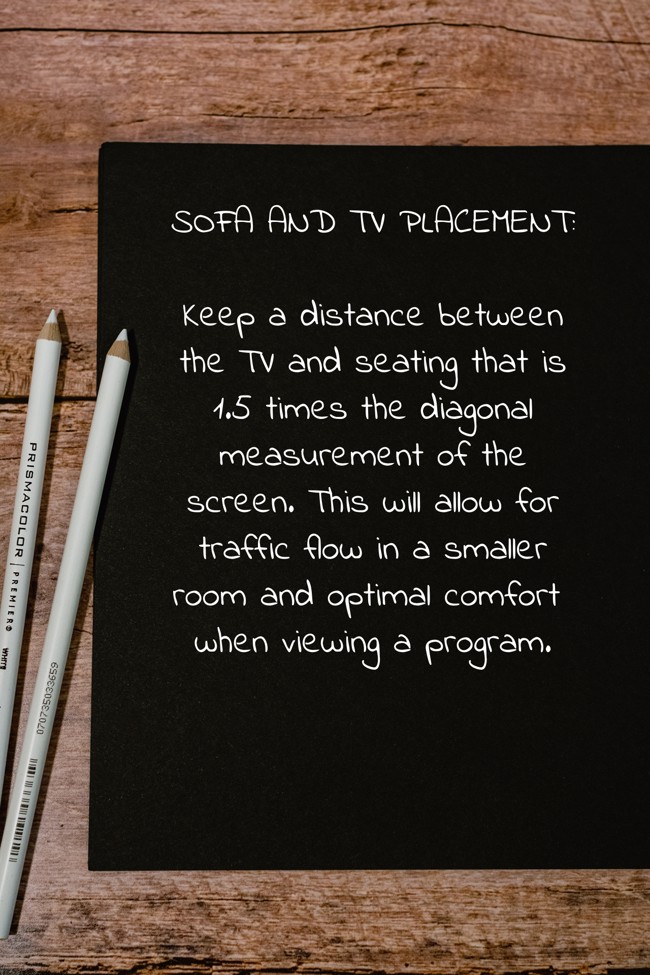 "SOFA AND TV PLACEMENT: Keep a distance between the TV and seating that is 1.5 times the diagonal measurement of the screen. This will allow for traffic flow in a smaller room and optimal comfort when viewing a program."