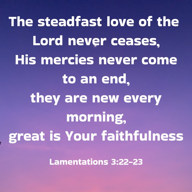 "The steadfast love of the Lord never ceases, His mercies never come to an end, they are new every morning, great is Your faithfulness"