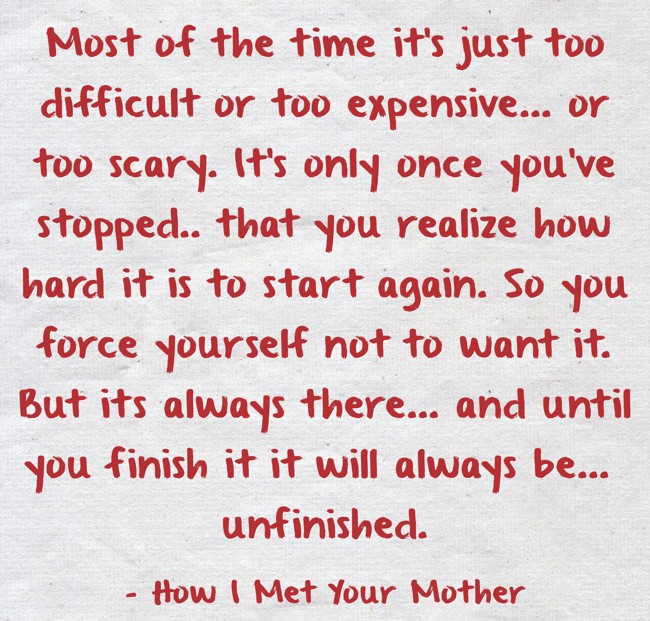"Most of the time it's just too difficult or too expensive... or too scary. It's only once you've stopped.. that you realize how hard it is to start again. So you force yourself not to want it. But its always there... and until you finish it it will always be... unfinished."