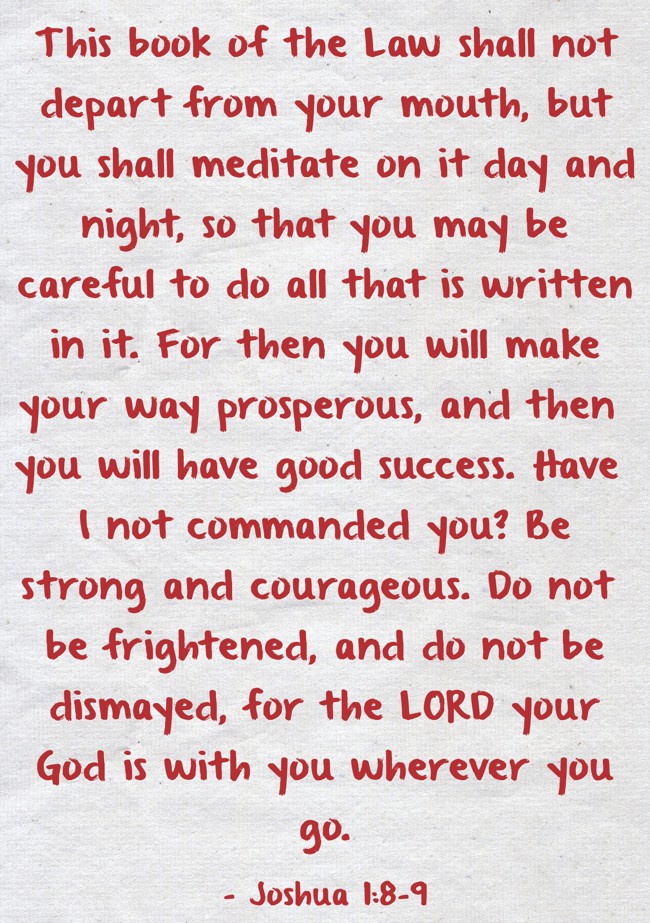 "This book of the Law shall not depart from your mouth, but you shall meditate on it day and night, so that you may be careful to do all that is written in it. For then you will make your way prosperous, and then you will have good success. Have I not commanded you? Be strong and courageous. Do not be frightened, and do not be dismayed, for the LORD your God is with you wherever you go."