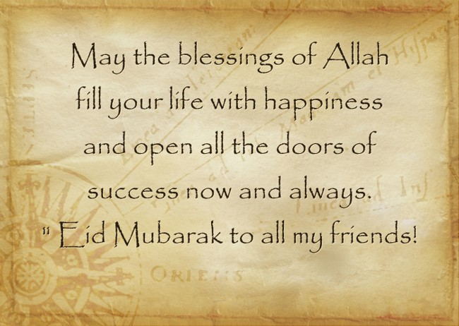 "May the blessings of Allah fill your life with happiness and open all the doors of success now and always. " Eid Mubarak to all my friends!"