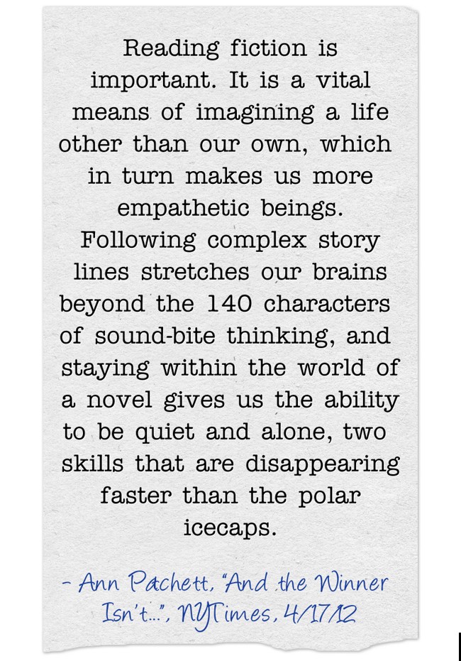 "Reading fiction is important. It is a vital means of imagining a life other than our own, which in turn makes us more empathetic beings. Following complex story lines stretches our brains beyond the 140 characters of sound-bite thinking, and staying within the world of a novel gives us the ability to be quiet and alone, two skills that are disappearing faster than the polar icecaps."