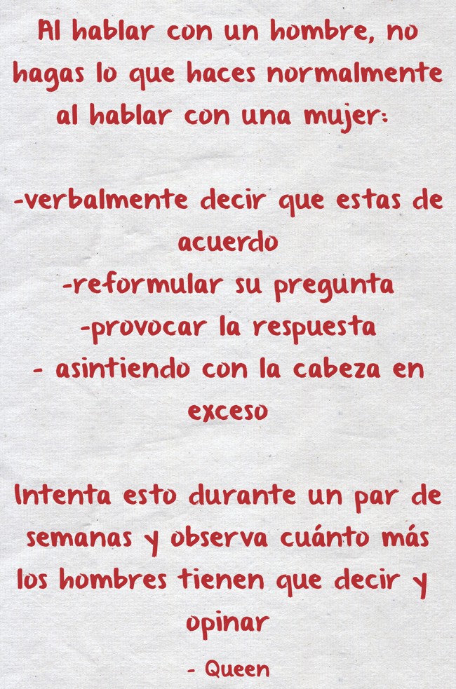 "Al hablar con un hombre, no hagas lo que haces normalmente al hablar con una mujer: -verbalmente decir que estas de acuerdo -reformular su pregunta -provocar la respuesta - asintiendo con la cabeza en exceso Intenta esto durante un par de semanas y observa cuánto más los hombres tienen que decir y opinar"
