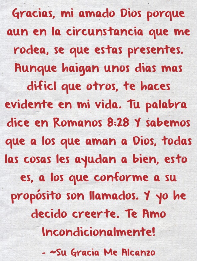"Gracias, mi amado Dios porque aun en la circunstancia que me rodea, se que estas presentes. Aunque haigan unos dias mas dificl que otros, te haces evidente en mi vida. Tu palabra dice en Romanos 8:28 Y sabemos que a los que aman a Dios, todas las cosas les ayudan a bien, esto es, a los que conforme a su propósito son llamados. Y yo he decido creerte. Te Amo Incondicionalmente!"