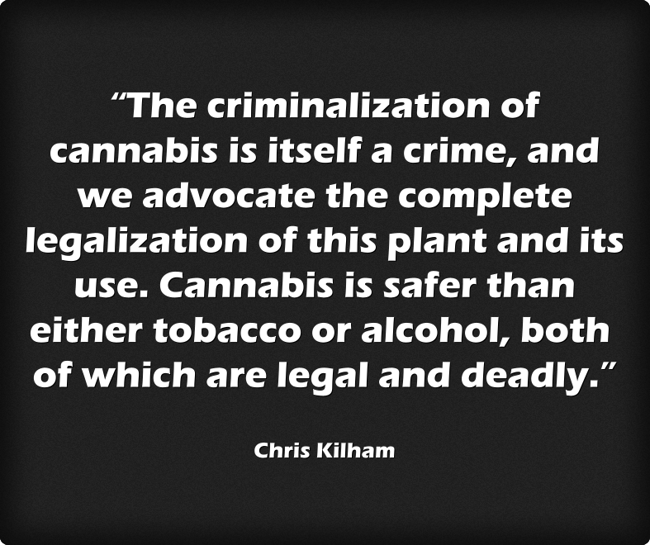 "“The criminalization of cannabis is itself a crime, and we advocate the complete legalization of this plant and its use. Cannabis is safer than either tobacco or alcohol, both of which are legal and deadly.”"