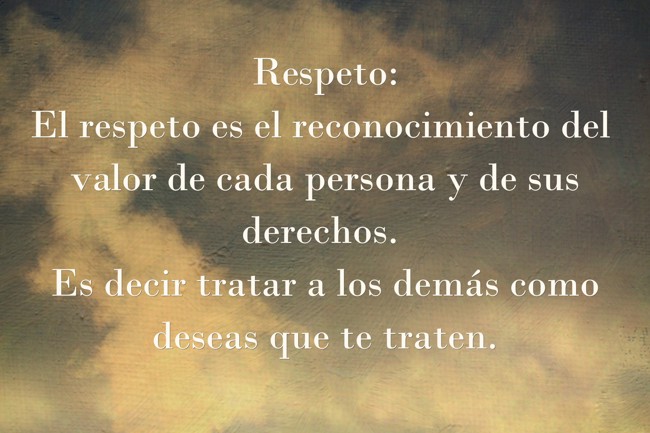 "Respeto: El respeto es el reconocimiento del valor de cada persona y de sus derechos. Es decir tratar a los demás como deseas que te traten. "