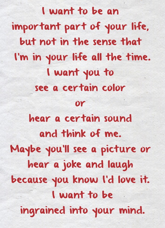 "I want to be an important part of your life, but not in the sense that I'm in your life all the time. I want you to see a certain color or hear a certain sound and think of me. Maybe you'll see a picture or hear a joke and laugh because you know I'd love it. I want to be ingrained into your mind."